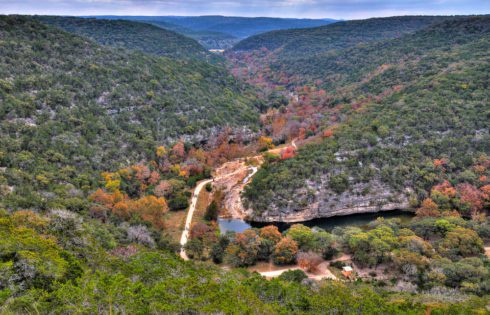Orange and red maple leaves scatter across boulders and blanket the valley floor near the banks of the Sabinal River in Lost Maples State Natural Area in central Texas. It’s