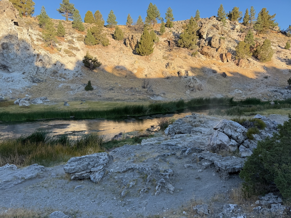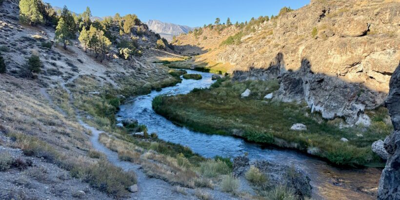 One of the coolest things about Hot Creek is how the Owens River slices right through the caldera floor, putting all those hydrothermal features on display. So you end up with a seriously bipolar river: a crisp, cold mountain stream weaving its way through pockets of steaming, mineral-rich water.