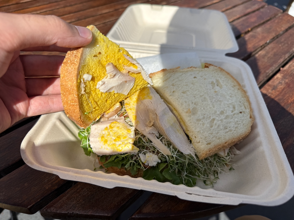 I was pleasantly surprised by my sandwich—it was way better than I expected. The turkey tasted more like the kind you’d have at Thanksgiving rather than thin deli slices, and they added sprouts, which gave it a unique texture. It took me a minute to get used to them, but I actually ended up really liking it. Everything else—the mustard, the tomato—was super fresh, and that soft sheepherder bread just tied it all together. I honestly wish more sandwiches were like that.