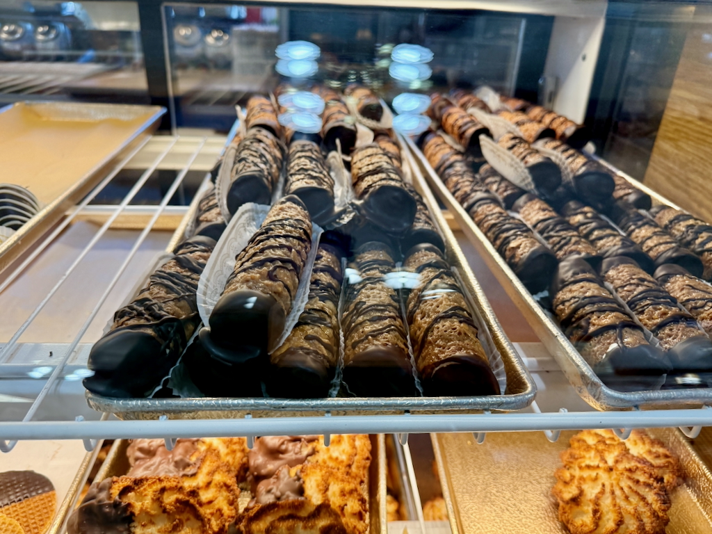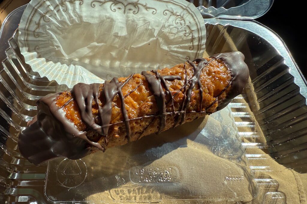 We wandered around for a bit, checking out all the pastries, and I finally settled on a cannoli—because I can never pass up a good cannoli. I could tell right away they’d done something different with it, and I was right. The shell had a crème brûlée-like flavor and an almost Stroopwafel-like texture, and the filling was sweeter than usual. Both ends were sealed in lovely chocolate, which made it even better. It was a really distinctive cannoli—super sweet, but incredibly tasty.