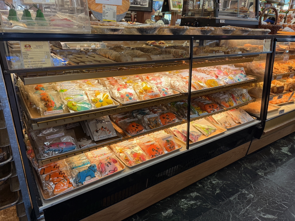 I went with the turkey club on the sheepherder bread, and Brad got the Mule Kick sandwich, which came on their mule bread—something a little different. We also grabbed some Route 11 chips, which I’m pretty sure come from the East Coast. After picking up our meals, we took one of the complimentary half cookies they hand out at the register (can’t say no to that) and wandered over to check out the pastry section—packed with all kinds of incredible-looking treats.